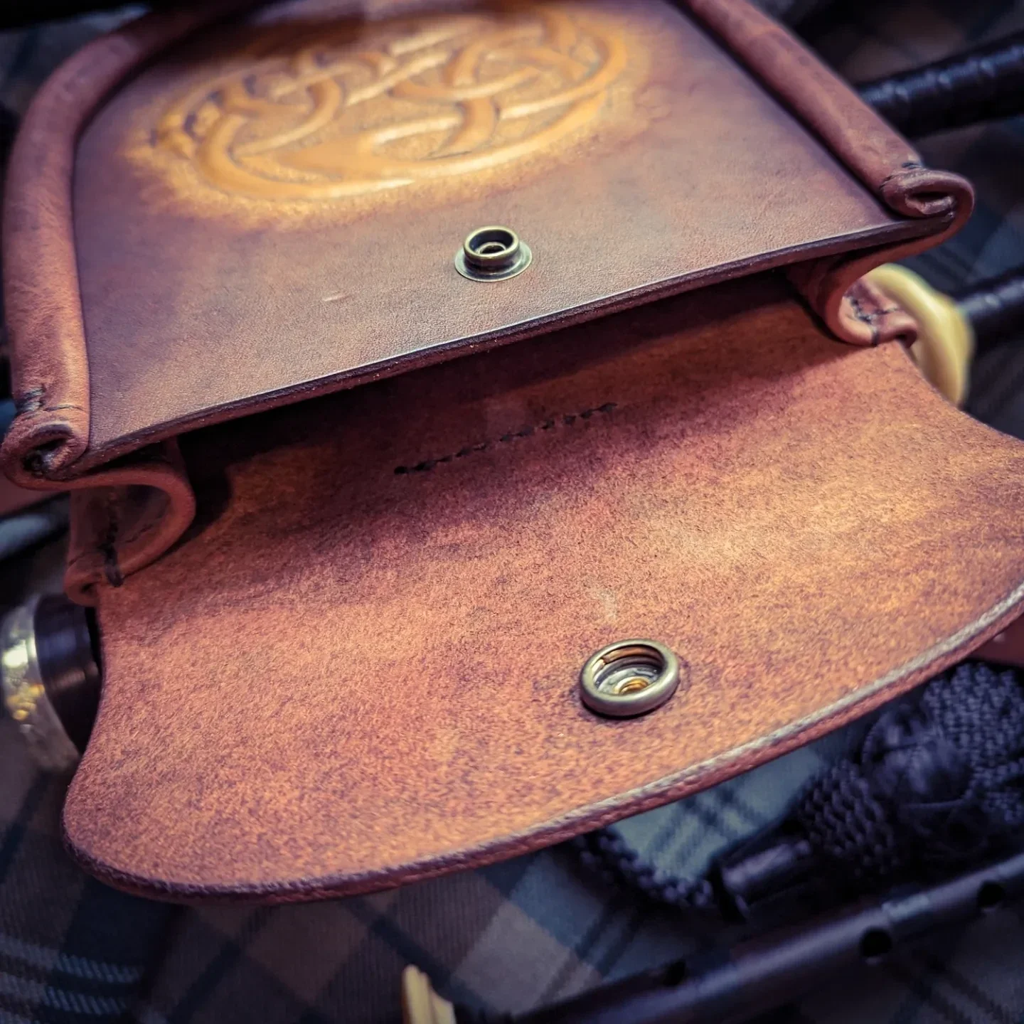 Introducing the Celtic Knot Day Sporran! This is a simple, rugged sporran adorned with a hand-engraved Celtic knot.